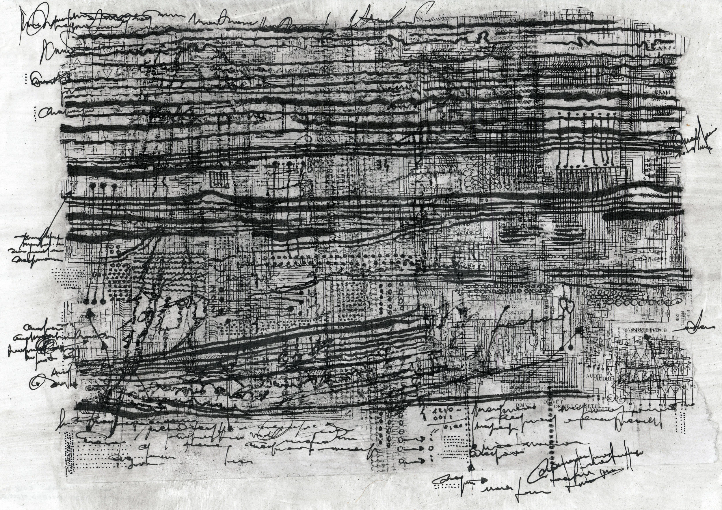 While writing is always the starting point, asemic writers express themselves on the edge between pure literature and visual art, often insisting on the original, innate characters of handwriting, rather than on traditionally text-based works: every dot, every stain or even every single digital bit in an image is as real as a consonant or a vowel. They often behave like smugglers, creeping along the guarded frontier of meaning, with their bags crammed with somewhat secret or confidential schemes, scripts, preparatory notes or sketchbooks. There may no longer be codes to draw signs from: language restlessly reinvents itself in the common forge of form and meaning.