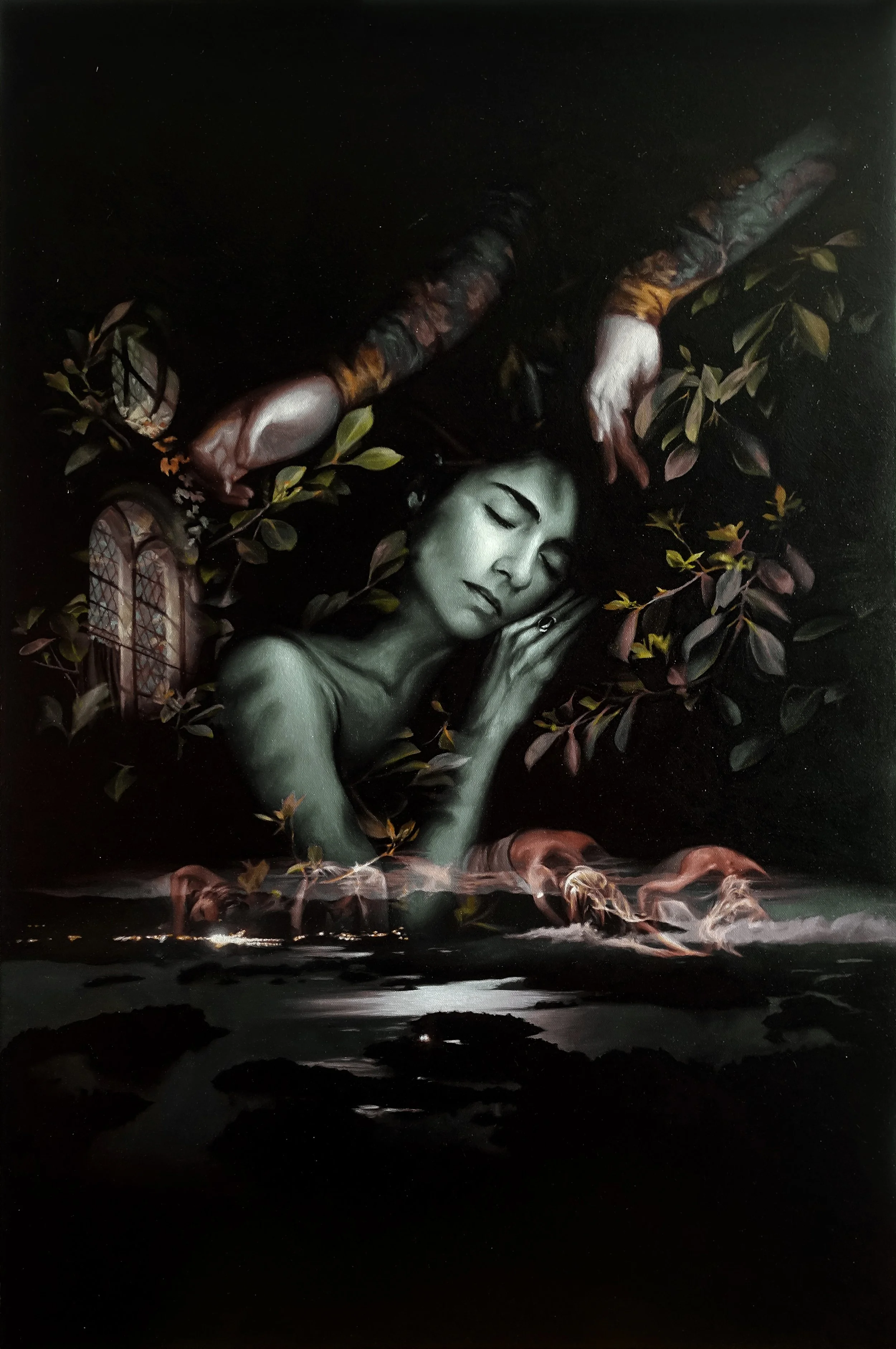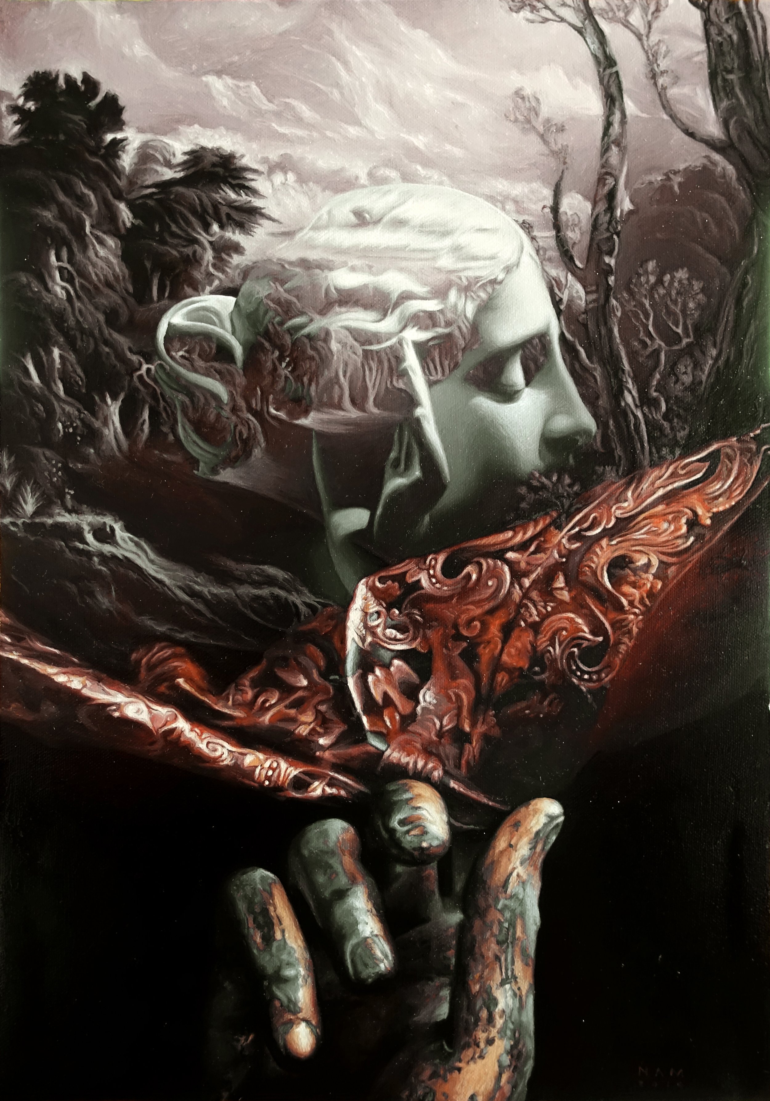 Filipino visual artist Nam Das is fascinated with open-ended themes that revolves around the collective unconscious and mythologems. He paints scenes inhabited by obscure figures and enigmatic objects that exudes a very stirring and mysterious aura. Intertwining a personal mythos and symbolism in a dreamlike state emerging from the darkness, illustrating a deeply personal world that is also universal at the same time. Nam practices with a Zorn palette in his paintings consisting of a limited four colors. He currently lives and works in Baguio, Philippines.