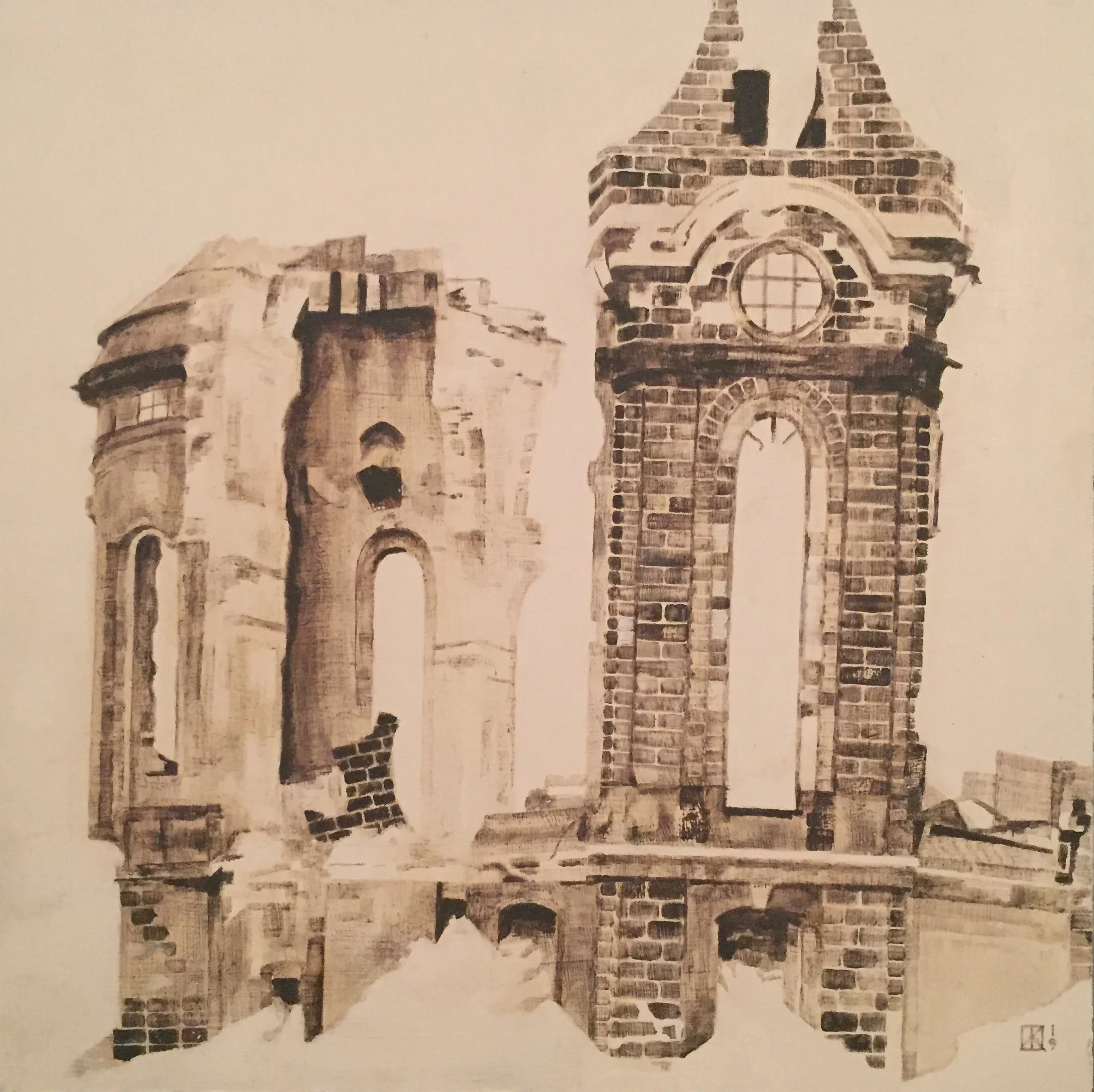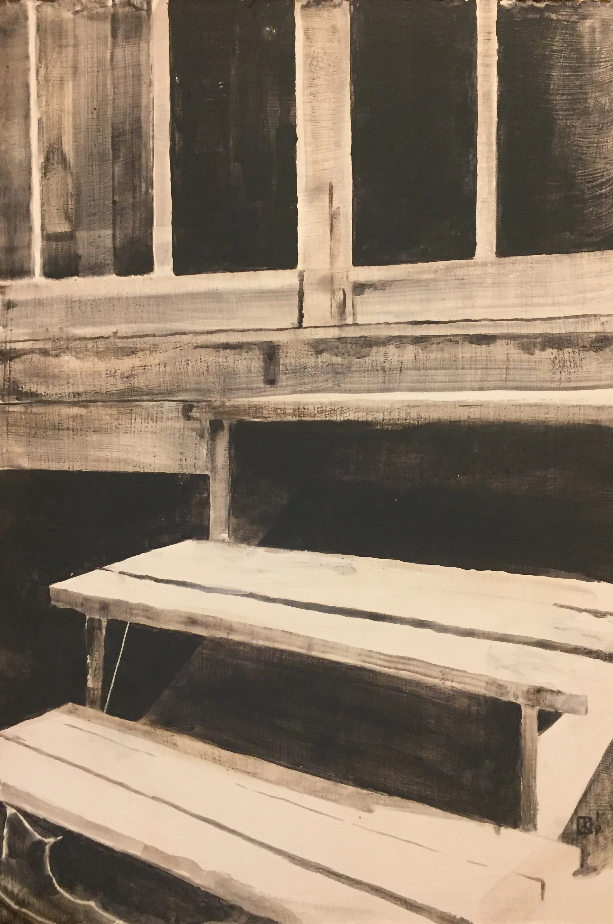 These paintings meet photos at a perpendicular angle. The colors were inspired by photographic black and whites, though the paintings are not actually black and white. I am blending primary colors, and painting in the washes. They focus on artifacts of human activity, though there are no people in them. Only traces.